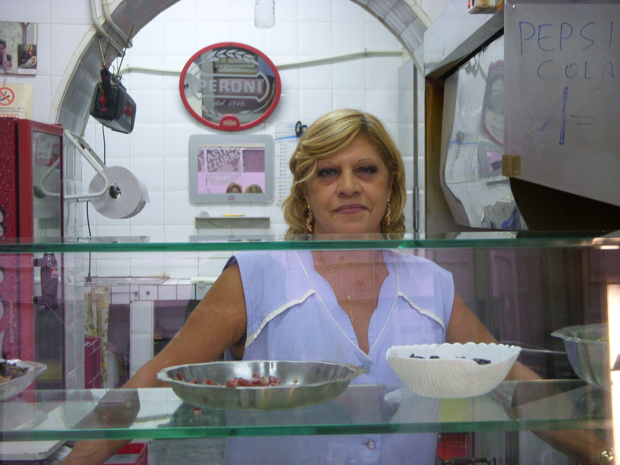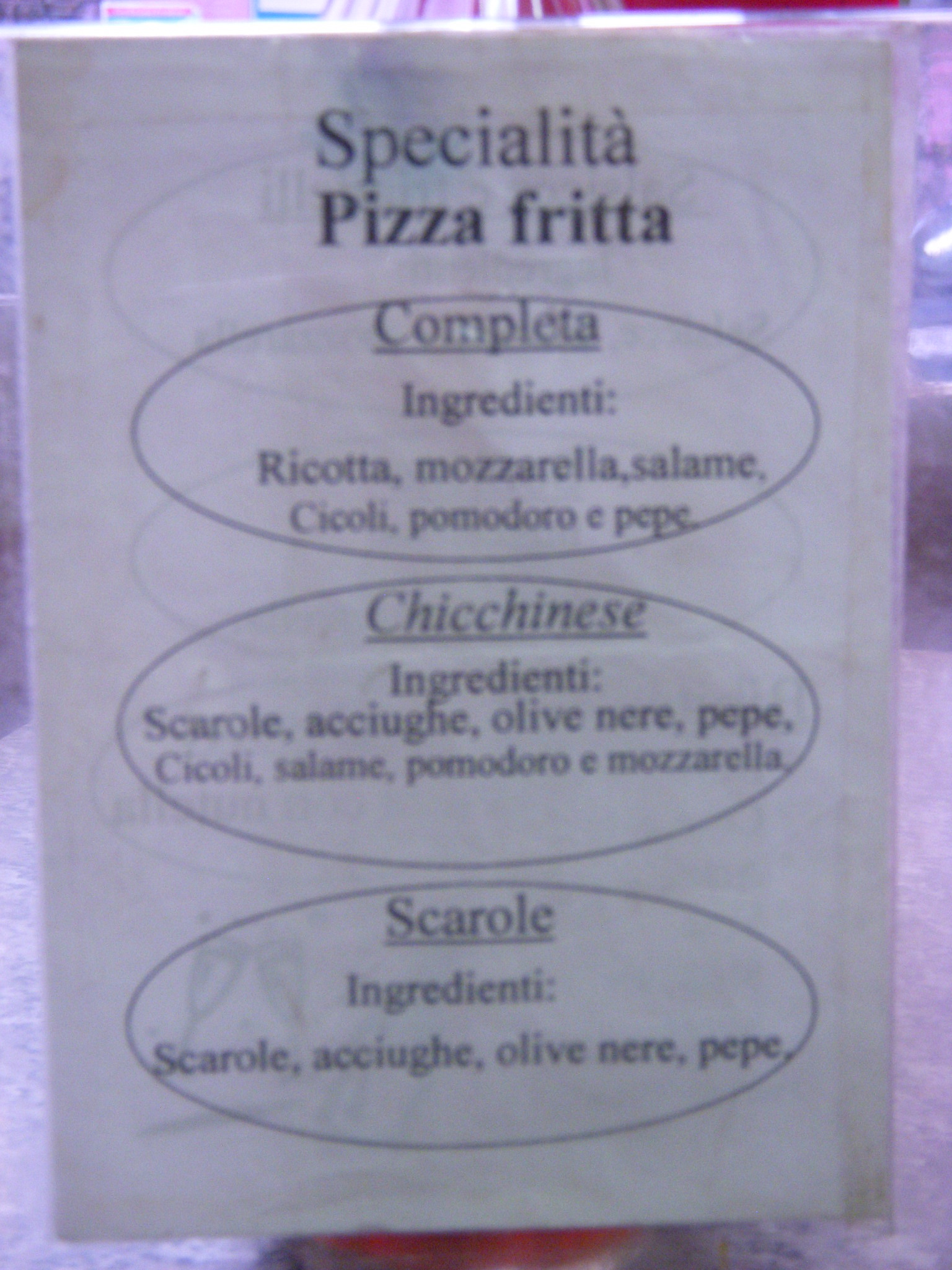 The pizza shop was a tiny little place. We walked into the entrance room which is where the pizza is made. There was a small seating area next door. The walls were lined with family photos going back several generations. This was why I wanted to eat pizza here. It has been owned and operated by the same family for over 5 generations. They know something about Pizza. I was there for the 5 Euro “special” – fried pizza and a coke. 1 Euro more for table service. A woman in a house coat greeted us. Well, not really greeted us, she nodded at us. She glistened slightly from the heat of the stoves. Without smiling she pointed at the ingredients set out on her table to make sure I understood what she would be making me. Fresh mozzarella, fresh ricotta, salami, pepperoni – none of it looked like what I was used to calling by these names but I was in an adventurous mood so I nodded yes and smiled.