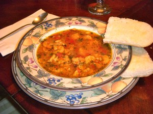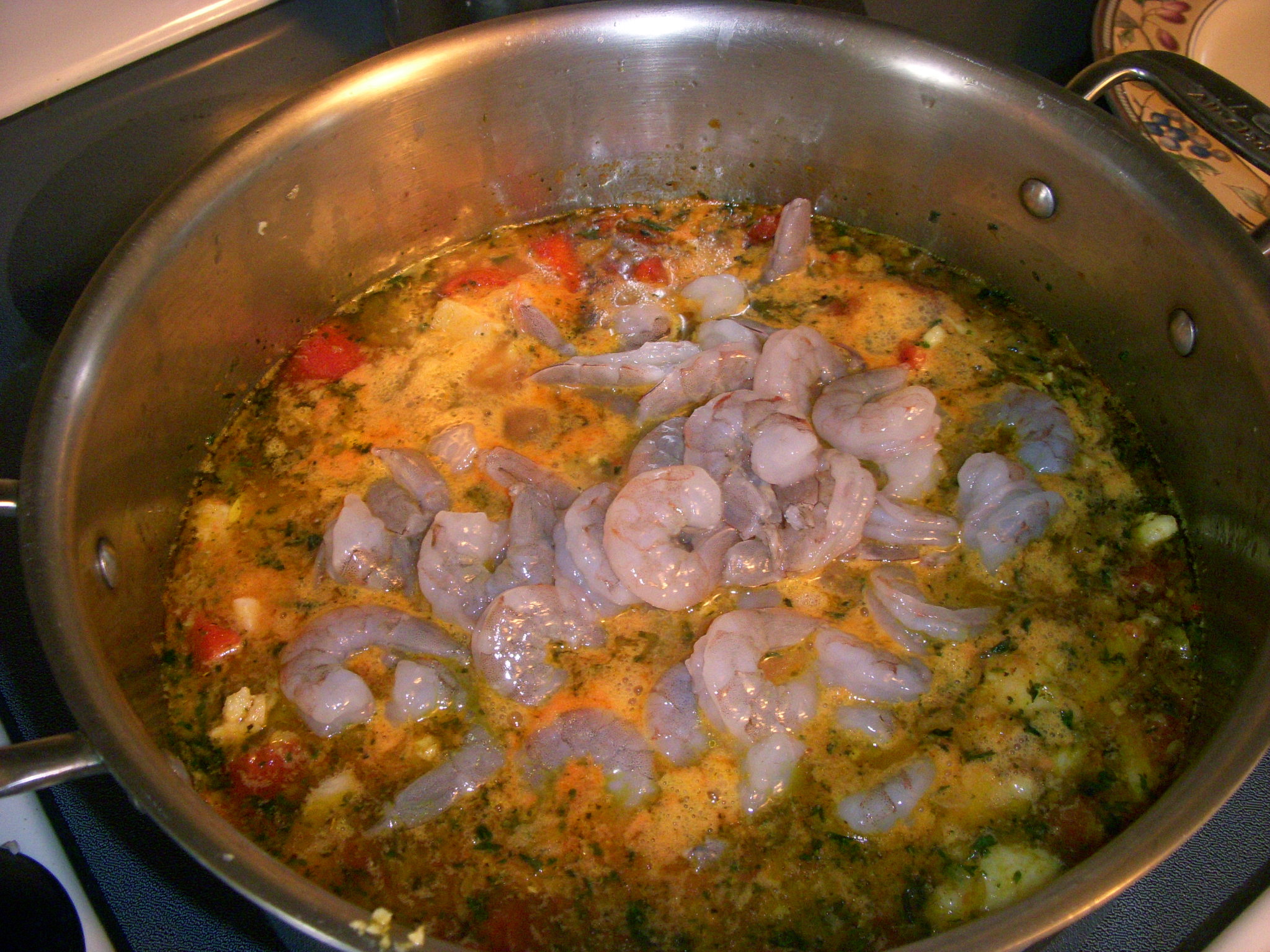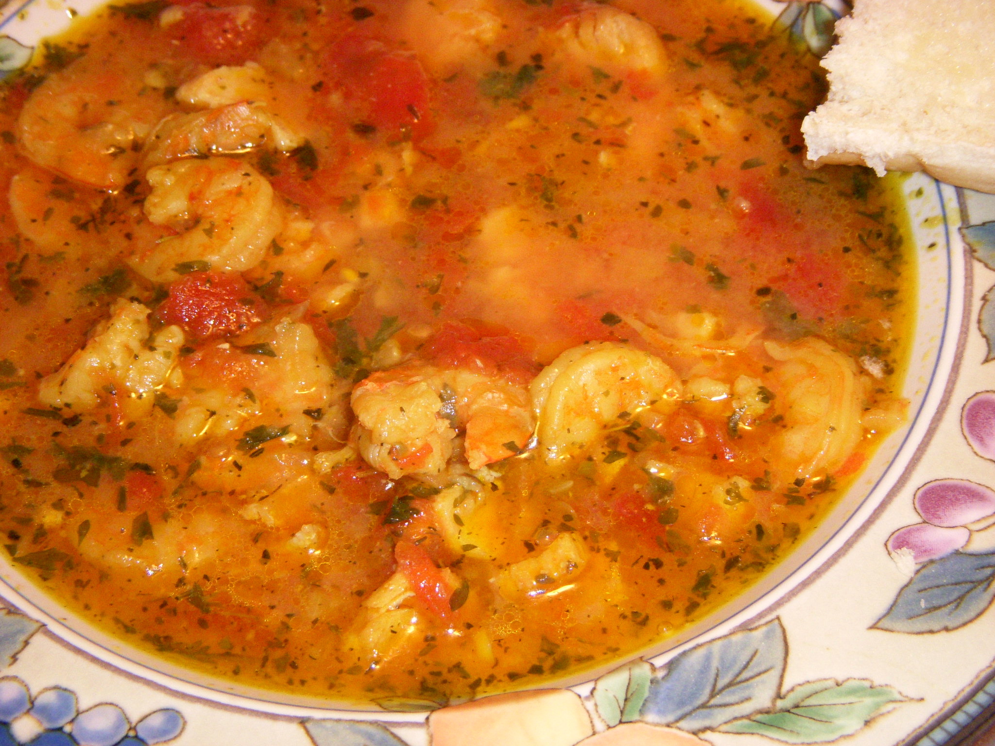 Saute onions and garlic in olive oil. Add parsley, basil, oregano and tumeric. Add the tomatoes (with juices) and wine. Stir and simmer for 5 minutes. Add fish and shrimp and simmer for 20 minutes. Serve with rustic, country bread brushed with olive oil and toasted in the oven.