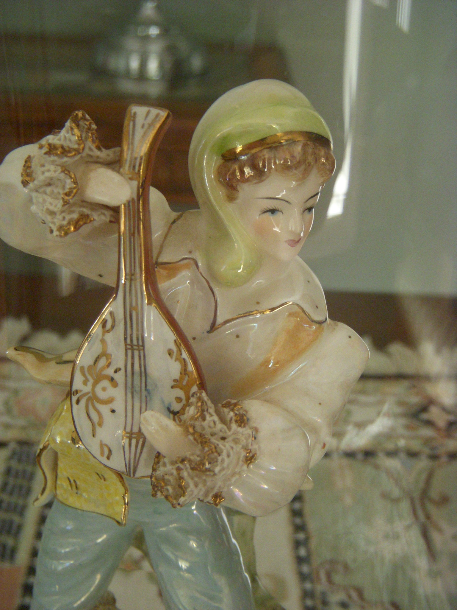 Aside from beauty and intelligence which she inherited from her Mom, Jessica also inherited a house. This house is full of precious things collected over the years by her husband’s grandmother. She gave me the tour – showed me the silver and teapots, the statues and vases. One mandolin playing, pantaloon wearing dancer caught my eye.